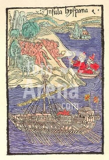 akg019043 Columbus, Christopher; seafarer, discoverer of America; 1451-1506. Works: Columbus' Letter on the Discovery of America (1493). The Landing in Hispaniola (Haiti). Woodcut (coloured). Illustration from the Latin first edition: Epistola Christofori Colom: de Insulis Indie. (...) inventis, Rome (E.Argenteus) 1493. Author: ANONYMOUS.