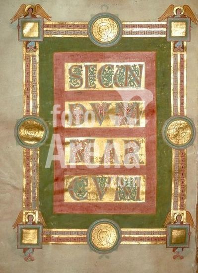 akg044175 Illumination, Echternach, c. 1050. Golden gospel book of Henry III. Continuation of the incipit "Secundum Marcum"; roundels with the young martyrs Stephen, George, Blasis and Pankratius. Format 35 × 50 cm. Escorial, Codex Vitrinas 17, fol. 62v. Author: ANONYMOUS.