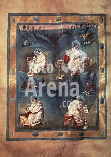 akg044245 Manuscript illumination, Carolingian (Set of the Viennese coronation gospel books), beginning of the 9th century. So-called "Schatzkammer Evangeliar". "The Four Evangelists". On parchment, 30.5 × 24cm. Aachen, property of the cathedral, Carolingian gospel book, fol. 14 v. Author: ANONYMOUS.