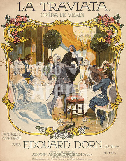 akg081982 Verdi, Giuseppe; It. composer, 1813-1901. Work: La Traviata (Opera; text by F.M. Piave after Dumas fils; pr. 1853). Title page of the piano edition: La Traviata, Opera de Verdi, Fantaisie pour piano par Edouard Dorn, op. 39, no. 5, Offenbach am Main (Johann Andre) no date (c. 1910). Berlin, Sammlung Archiv für Kunst und Geschichte. Museum: Berlin, Sammlung Archiv für Kunst und Geschichte. Author: ANONYMOUS.