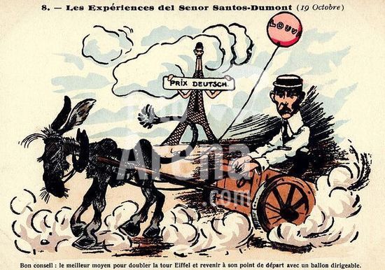 akg375175 Santos-Dumont, Alberto Brasilian flight pioneer (built airships from1896 and motor planes from 1906). 1873-1932. "Les Expériences del Senor Santos-Dumont" (Caricature of Santos-Dumont about his flight around the Eiffel Tower on 19 October 1901). Picture postcard (colour lithograph). Paris, Private Collection. Museum: Paris, Private Collection. Author: ANONYMOUS.