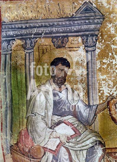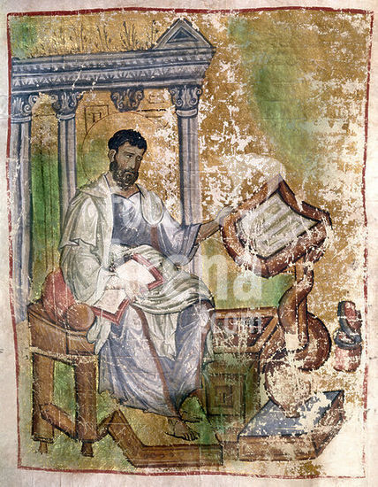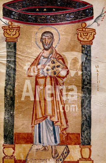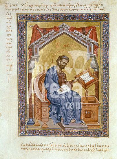 akg3862892 Buchmalerei, byzantinisch, frühmakedonisch, Mitte des 9. Jahrhunderts. - Der Evangelist Markus. - Aus einem Tetraevangeliar (Handschrift des 12. Jahrhunderts, der fünf ganzseitige Miniaturen des 9. Jahrhunderts eingebunden sind).. Auf Pergament, 18,1 x 14,1 cm. Herkunft: Berg Athos. Cod. Garrett 6, fol. 54 v, Princeton University, Library. Museum: Princeton University, Library. Author: ANONYMOUS.