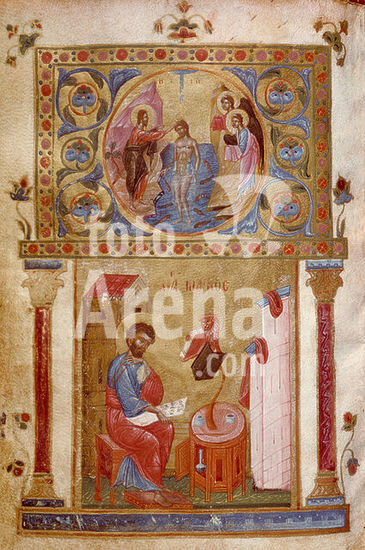 akg3862880 Buchmalerei, byzantinisch, 10. und 12. Jahrhundert. - Der Evangelist Markus / Die Taufe Christi. - Aus einem Tetraevangeliar. Auf Pergament, 15,2 x 11 cm. Ms 1, fol. 147 v, Kloster Megaspileon / Mega Spilaion (Peloponnes), Bibliothek. Author: ANONYMOUS.