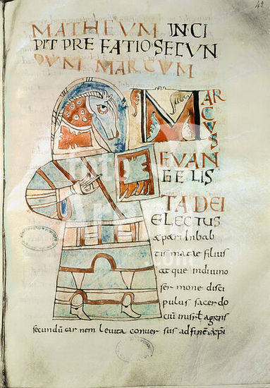 akg3882087 Buchmalerei, Bretagne, Abtei von Landévennec, 2. Hälfte des 9. Jahrhunderts. - Der Evangelist Markus. - Aus einem Evangeliar aus Landévennec. Auf Pergament, Blattformat 26,5 x 20 cm. Ms 8, folio 42 recto. Boulogne-sur-Mer, Municipal Library. Museum: Boulogne-sur-Mer, Municipal Library. Author: ANONYMOUS.