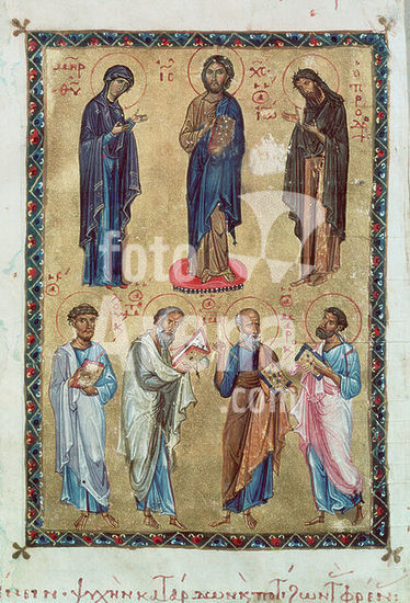 akg4409352 Buchmalerei, byzantinisch, 1. Hälfte des 12. Jahrhunderts. - Deesis mit Evangelisten. - (Christus zwischen der Gottesmutter und Johannes dem Vorläufer; im unteren Register die vier Evanglisten). Eingangsseite eines Evangeliars. Cod. 3. Istanbul, Ökumenisches Patriarchat von Konstantinopel. Museum: Berlin, Sammlung Archiv für Kunst und Geschichte. Author: ANONYMOUS.
