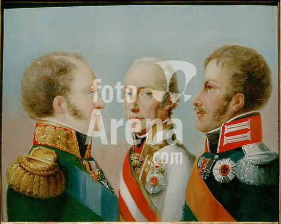 akg4508346 Heilige Allianz (Bündnis der drei Monarchen Russlands, Österreichs und Preußens nach dem endgütligen Sieg über Kaiser Napoleon I., geschlossen in Paris am 28. September 1815 mit der Selbstverpflichtung zur Sicherung von Religion, Frieden und Gerechtigkeit). - "Die Heilige Allianz". - (Bildnisse der drei Monarchen, von links Kaiser Alexander I. von Russland, Kaisr Franz I. von von Österreich und König Friedrich Wilhelm III. von Preußen). Gemälde, unbekannter (Wiener?) Maler, um 1815. Öl auf Holz, 14,7 x 18,2 cm. Inv. Nr. GK I 30113. Potsdam, SPSG Berlin-Brandenburg. Museum: Berlin, Sammlung Archiv für Kunst und Geschichte. Author: ANONYMOUS.