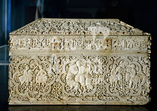 akg5117279 Moorish art, Spain during the time of the Caliphate of Cordoba. Made by the Moorish craftsman Faray and his workshop, 1004. Ivory casket from Leyre decorated with images of the Caliph Abd al-Malik. Ivory, overall size: 23.6 x 38.4 x. 23.7 cm. From the Monastery of Leyre. Photo. Pamplona, Museo de Navarra. Author: ANONYMOUS.