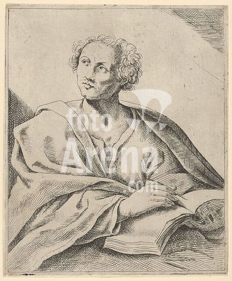 alb3616066 A man holding a book, about to write in it, looking upwards to the left, after Reni (?). Artist: Anonymous; After (?) Guido Reni (Italian, Bologna 1575-1642 Bologna). Dimensions: Sheet (Trimmed): 7 1/2 × 6 1/4 in. (19 × 15.9 cm). Date: 17th century. Museum: Metropolitan Museum of Art, New York, USA.