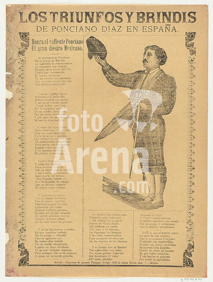 alb3627798 Broadsheet relating to the triumphs of the bullfighter Ponciano Diaz in Spain, a corrida (ballad) in the bottom section. Artist: Anonymous. Dimensions: Sheet: 15 9/16 × 11 7/16 in. (39.5 × 29 cm). Publisher: Antonio Vanegas Arroyo (1850-1917, Mexican). Date: ca. 1900-10. Museum: Metropolitan Museum of Art, New York, USA.
