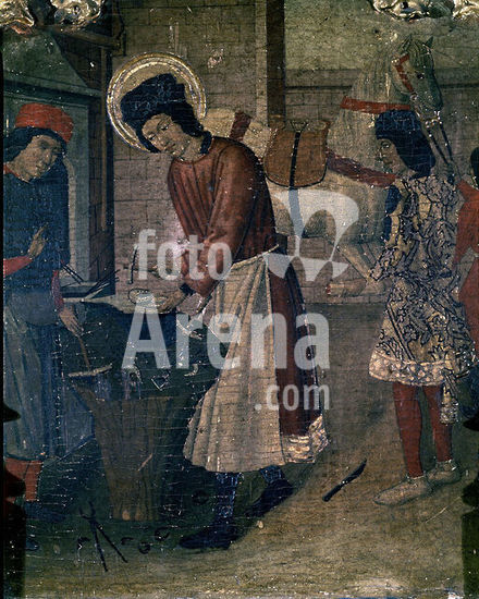 orz004180 RETABLO DE SAN SEBASTIAN - DETALLE DE SAN ELOY TRABAJANDO DE HERRERO - PINTURA GOTICA ESPAÑOLA. Author: ANONYMOUS. Location: MUSEU NACIONAL D'ART CATALUNYA. Barcelona. SPAIN.