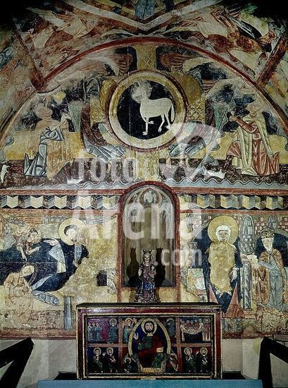 orz035721 BOVEDA:PANTOCRATOR-MEDIO PUNTO:CAIN Y ABEL OFRENDAN AL CORDERO - PINTURA MURAL DE LA ERMITA DE LA VERA CRUZ DE MADERUELO - SIGLO XII. Author: ANONYMOUS. Location: MUSEO DEL PRADO-PINTURA. MADRID. SPAIN. JESUS. ABEL. CAIN. PADRE ETERNO. DIOS.