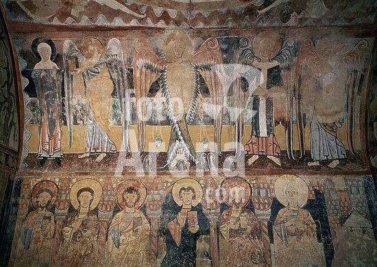 orz024482 EL PANTOCRATOR SOSTENIDO POR CUATRO ANGELES - PINTURA MURAL DE LA ERMITA DE LA VERA CRUZ DE MADERUELO - SIGLO XII - ROMANICO ESPAÑOL. Author: ANONYMOUS. Location: MUSEO DEL PRADO-PINTURA. MADRID. SPAIN. CRISTO JUEZ. CRISTO EN MAJESTAD.