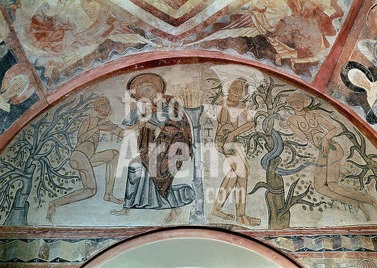 orz024489 CREACION DE ADAN Y EVA - ARCO DE INGRESO - PINTURA MURAL DE LA ERMITA DE LA VERA CRUZ DE MADERUELO - SIGLO XII - ROMANICO ESPAÑOL. Author: ANONYMOUS. Location: MUSEO DEL PRADO-PINTURA. MADRID. SPAIN. EVE. Adam. DIOS PADRE.