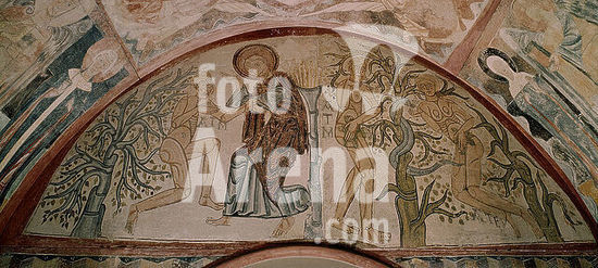 orz024488 CREACION DE ADAN Y EVA - ARCO DE INGRESO - PINTURA MURAL DE LA ERMITA DE LA VERA CRUZ DE MADERUELO - SIGLO XII - ROMANICO ESPAÑOL. Author: ANONYMOUS. Location: MUSEO DEL PRADO-PINTURA. MADRID. SPAIN. EVE. Adam. DIOS PADRE.