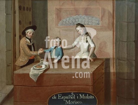 orz025459 Mixed marriage between a Spaniard and a Person of Mixed Race - Morisco. Mestizaje - de Español y mulata : Morisco. Painting on copper. 48 x 36 cm. 18th century. Madrid, Museum of America. Author: ANONYMOUS. Location: MUSEO DE AMERICA-COLECCION. MADRID. SPAIN.
