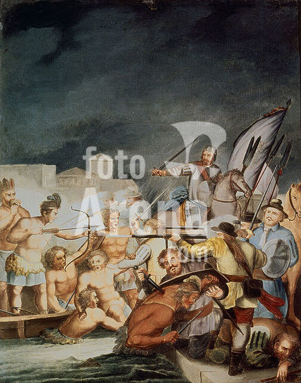 orz025480 CONQUISTA DE MEXICO-LA NOCHE TRISTE- 1520 - PINTADO EN COBRE- S XVIII. Author: ANONYMOUS. Location: MUSEO DE AMERICA-COLECCION. MADRID. SPAIN. HERNAN CORTES.