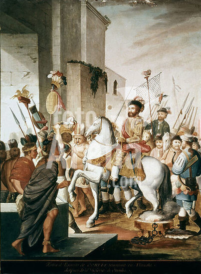 orz025481 CONQUISTA DE MEXICO - ENTRADA TRIUNFANTE DE HERNAN CORTES Y SU EJERCITO EN TLAXCALA - PINTURA EN COBRE - SIGLO XVIII. Author: ANONYMOUS. Location: MUSEO DE AMERICA-COLECCION. MADRID. SPAIN.