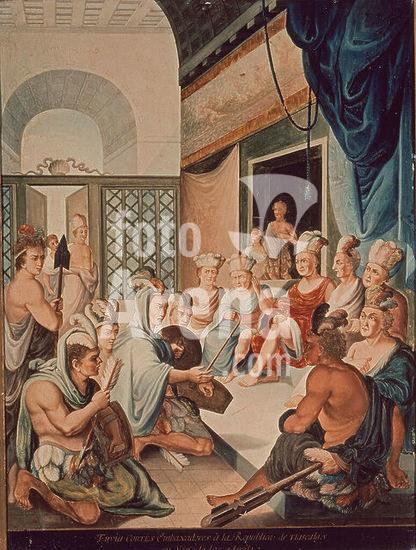 orz025482 CORTES MANDA EMBAJADORES A TLAXCALA Y EL SENADO LOS ADMITE - PINTADO EN COBRE- SIGLO XVIII. Author: ANONYMOUS. Location: MUSEO DE AMERICA-COLECCION. MADRID. SPAIN.