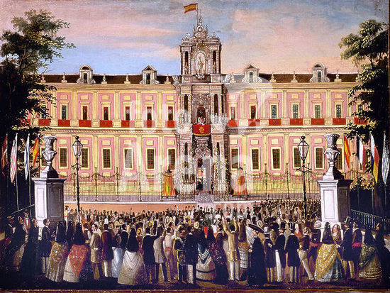 orz057012 ISABEL II EN SEVILLA 1862 - LOS REYES SALUDAN DESDE EL PALACIO DE SAN TELMO. Author: ANONYMOUS. Location: PRIVATE COLLECTION. Sevilla. Seville. SPAIN. ISABEL II REINA DE ESPAÑA (1830-1904). FRANCISCO DE ASIS (1822-1902).