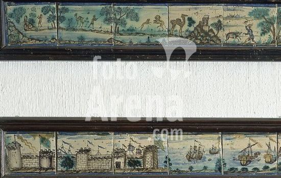 orz057068 AZULEJOS - ARRIBA: CACERIA EN AFRICA - ABAJO: LLEGADA A LAS INDIAS - 1699. Author: ANONYMOUS. Location: PRIVATE COLLECTION. Sevilla. Seville. SPAIN.