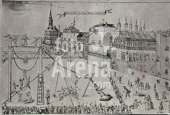 orz084127 LOS HERMANOS BURATINES OFRECEN UN ESPECTACULO DE FUNAMBULISMO FRENTA AL ALCAZAR DE MADRID EN EL SIGLO XVI. Author: ANONYMOUS. Location: MUSEO DE HISTORIA-GRABADOS BLANCO Y NEGRO. SPAIN.