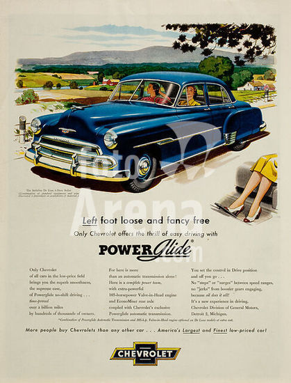 Verkehr / Automobil / Chevrolet. - "Left foot loose and fancy free / Only Chevrolet offers the thrill of easy driving with POWERGlide". - Werbung für Styleline De Luxe 4-Door Sedan der Marke Chevrolet von General Motors, Detroit (USA) mit Zweistufenautomatik Powerglide. Farbdruck, 1951, nach anonymer Zeichnung. Aus einer illustrierten Zeitschrift. Privatsammlung.