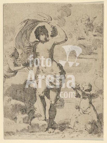 alb3666652 Venus stepping out of the sea, holding a billowing drapery in her left hand, Cupid at right offering pearls while riding a dolphin and a putto at left offering flowers, another in the clouds. Artist: Anonymous; After (?) Guido Reni (Italian, Bologna 1575-1642 Bologna). Dimensions: Sheet: 8 11/16 × 6 1/2 in. (22.1 × 16.5 cm). Date: ca. 1600-1640. Museum: Metropolitan Museum of Art, New York, USA.