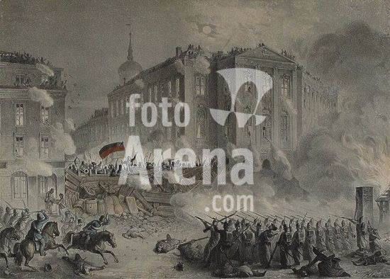alb3593832 Barricade fighting at the Alexanderplatz in Berlin on the night of 18 to 19 March 1848. Museum: Russian State Historical Library, Moscow. Author: ANONYMOUS.