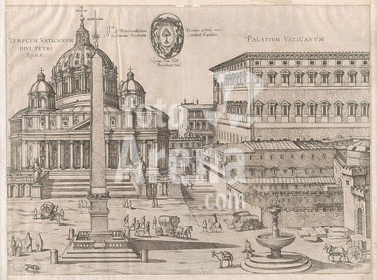 alb3673747 Speculum Romanae Magnificentiae: St. Peter's. Artist: Anonymous. Dimensions: sheet: 17 7/8 x 22 1/16 in. (45.4 x 56 cm)plate: 15 1/2 x 20 7/8 in. (39.4 x 53 cm). Publisher: Nicolaus van Aelst (Flemish, Brussels 1526-1613 Rome). Series/Portfolio: Speculum Romanae Magnificentiae. Date: 16th century.This print comes from the museum's copy of the Speculum Romanae Magnificentiae (The Mirror of Roman Magnificence) The Speculum found its origin in the publishing endeavors of Antonio Salamanca and Antonio Lafreri. During their Roman publishing careers, the two foreign publishers - who worked together between 1553 and 1563 - initiated the production of prints recording art works, architecture and city views related to Antique and Modern Rome. The prints could be bought individually by tourists and collectors, but were also purchased in larger groups which were often bound together in an album. In 1573, Lafreri commissioned a title page for this purpose, which is where the title 'Speculum Romanae Magnificentiae' first appears. Lafreri envisioned an ideal arrangement of the prints in 7 different categories, but during his lifetime, never appears to have offered one standard, bound set of prints. Instead, clients composed their own selection from the corpus to be bound, or collected a group of prints over time. When Lafreri died, two-third of the existing copper plates went to the Duchetti family (Claudio and Stefano), while another third was distributed among several publishers. The Duchetti appear to have standardized production, offering a more or less uniform version of the Speculum to their clients. The popularity of the prints also inspired other publishers in Rome to make copies however, and to add new prints to the corpus. The museum's copy of the Speculum entered the collection as a group of 3 albums with inlaid engravings and etchings. The prints have since been removed, but the original place of each print within the album is contained in the accession number: 41.72(volume.place).Originally volume 3, plate 19 in the scrapbook. Museum: Metropolitan Museum of Art, New York, USA.