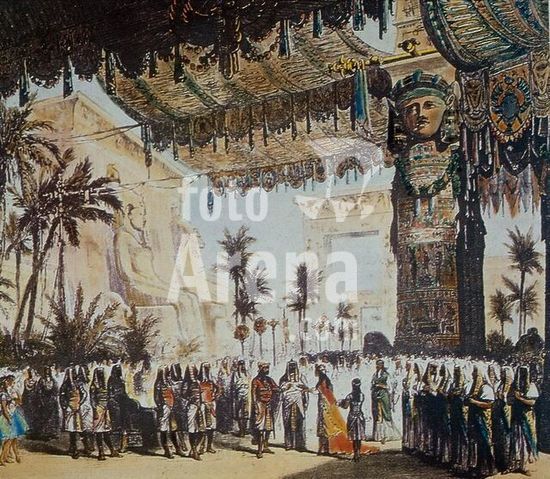 akg018666 Verdi, Giuseppe Italian composer, 1813 - 1901. Work: Aida (Opera, libretto Antonio Gislandi, première Cairo 1871). Set design for the 1880 Paris production. (Design by: Jean-Bapstiste Lavastre). Woodcut, coloured, contemporary. Author: ANONYMOUS.