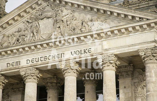 alb18694750 Berlin, Germany. Reichstag Building. Seat of the German Bundestag (national parliament of the Federal Republic of Germany). Built between 1884 and 1894 by Paul Wallot. Pediment with the inscription "Dem Deutschen Volke" (To the German People). It was added to the western facade in 1916.