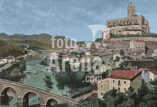 alb4860478 Spain, Catalonia, province of Barcelona, Manresa. View of the town taken from the "Pont Vell" (Old Bridge), over Cardener river. In the background the Cathedral or Basilica of Santa Maria de la Seu. Engraving by Capuz. La Ilustracion Espa–ola y Americana, 1881. Later colouration.