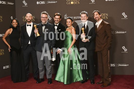 2611J10_UH022 Peter Huyck, rida Perez, Seth Rogen, Alex Gregory, Chase Sui Wonders, Evan Goldberg, James Weaver in the press room for 83rd Annual Golden Globes - Photo Room, Beverly Hilton Hotel, Beverly Hills, CA, January 11, 2026. Photo By: Elizabeth Goodenough/Everett Collection/ Fotoarena