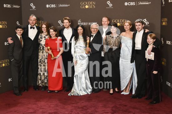 2611J10_UH024 Pippa Harris, Maggie O'Farrell, Joe Alwyn, Jessie Buckley, Chloé Zhao, Jacobi Jupe, Max Richter, Liza Marshall, Noah Jupe, Paul Mescal, Steven Spielberg, Nicolas Gonda in the press room for 83rd Annual Golden Globes - Photo Room, Beverly Hilton Hotel, Beverly Hills, CA, January 11, 2026. Photo By: Elizabeth Goodenough/Everett Collection/ Fotoarena