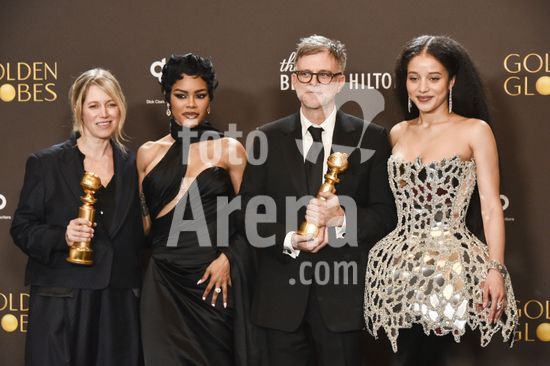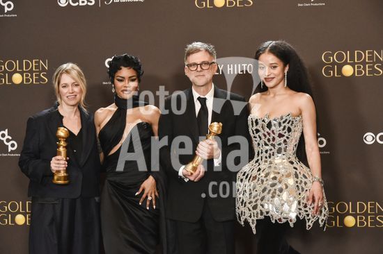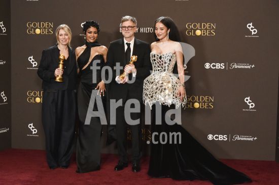 2611J10_UH074 Sara Murphy, Teyana Taylor, Paul Thomas Anderson, Chase Infiniti in the press room for 83rd Annual Golden Globes - Photo Room, Beverly Hilton Hotel, Beverly Hills, CA, January 11, 2026. Photo By: Elizabeth Goodenough/Everett Collection/ Fotoarena