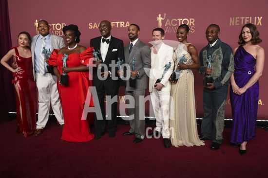2601H10_UH092 Li Jun Li, Omar Benson Miller, Wunmi Mosaku, Delroy Lindo, Michael B. Jordan, Jack O'Connell, Jayme Lawson, Miles Caton and Lola Kirke in the press room for The 32nd Annual Screen Actors Guild SAG Awards - Press Room, Shrine Auditorium and Expo Hall, Los Angeles, CA, March 01, 2026. Photo By: Elizabeth Goodenough/Everett Collection/ Fotoarena