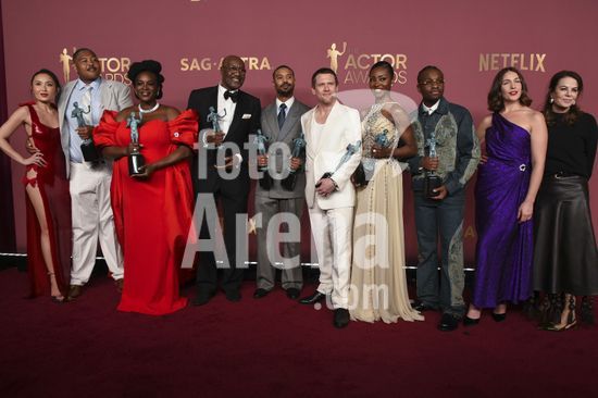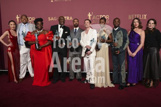 2601H10_UH094 Li Jun Li, Omar Benson Miller, Wunmi Mosaku, Delroy Lindo, Michael B. Jordan, Jack O'Connell, Jayme Lawson, Miles Caton and Lola Kirke in the press room for The 32nd Annual Screen Actors Guild SAG Awards - Press Room, Shrine Auditorium and Expo Hall, Los Angeles, CA, March 01, 2026. Photo By: Elizabeth Goodenough/Everett Collection/ Fotoarena