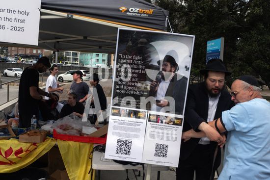 ny191225135215 Underneath a poster bearing a quotation from Rabbi Eli Schlanger, who was killed in the Bondi Beach massacre, an Orthodox Jewish man affixes a tefillin to the arm of a mourner at a tent set up to collect donations for the victims and their families in Sydney, Australia, on Friday, Dec. 19, 2025. The Australian government will launch a gun buyback program to take hundreds of thousands of firearms off the streets, Prime Minister Anthony Albanese said Friday, following a shooting rampage at a Jewish holiday festival at Bondi Beach that killed 15 people. (Matthew Abbott/The New York Times/Fotoarena)