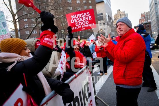 ny120126111312 A nurse who works the overnight shift is greeted by striking colleagues as he leaves Mount Sinai Hospital in Manhattan, one of the hospitals affected by a strike, on Monday morning, Jan. 12, 2026. The striking nurses are aiming to force hospitals to ensure minimum staffing ratios. (Vincent Alban/The New York Times/Fotoarena)