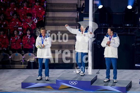 ny220226184812 Martin Loewstroem Nyenget of Norway, silver medalist, Johannes Hoesflot Klaebo of Norway, gold medalist, and Emil Iversen of Norway, bronze medalist, on the podium at a medal ceremony for the cross country skiing men's 50km mass start classic during the closing ceremony of the 2026 Milan Cortina Winter Olympics at the Verona Arena in Verona, Italy, on Sunday, Feb. 22, 2026. (Vincent Alban/The New York Times/Fotoarena)