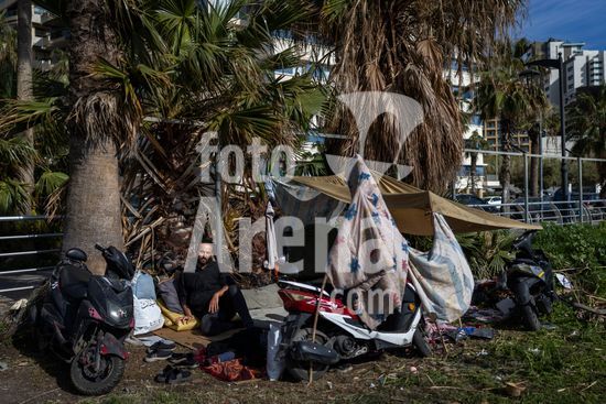 ny060326115611 A man sits outside the makeshift shelter that he built for his wife and children after fleeing the southern suburbs on the Corniche, the seaside promenade in Beirut, Lebanon, on Friday, March 6, 2026. The Israeli military pounded Beirut with airstrikes on Friday morning and issued more evacuation warnings in southern Lebanon as it intensified its campaign against Iran-backed Hezbollah militants. (Diego Ibarra Sanchez/The new York Times)