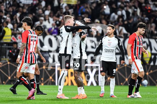 2845863 Jogadores do Corinthians comemoram a vitória e jogadores do São Paulo lamentam a derrota durante partida entre Corinthians x São Paulo FC, válida pela trigésima quarta rodada do Campeonato Brasileiro de Futebol 2025, nesta quinta feira (20), na Neo Química Arena, SP.