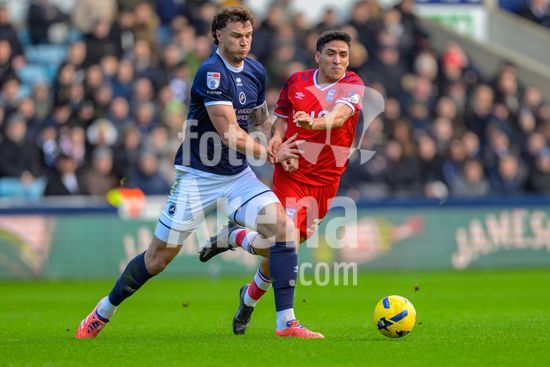 2862922 Marcelino Nunez (32 Ipswich Town) sofre falta de Jake Cooper (5 Millwall) durante o jogo do Sky Bet Championship entre Millwall FC e Ipswich Town no The Den em Londres, Inglaterra. (Keeran Marquis/SPP)
