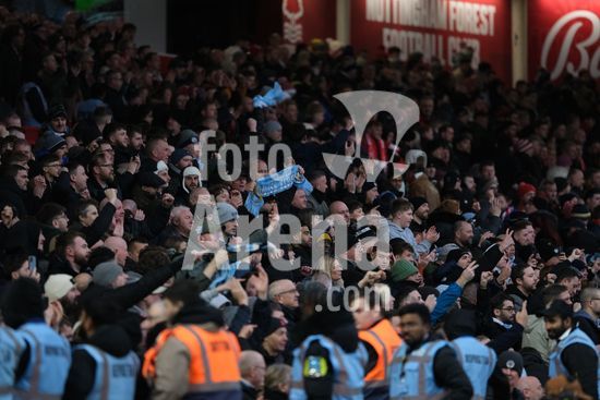 2863307 Torcedores do Manchester City durante a partida de futebol da Premier League entre Nottingham Forest e Manchester City no City Ground em Nottingham. (Paul Bonser/Sports Press Photo / SPP)