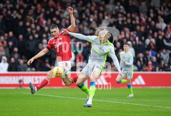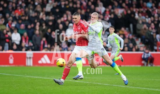 2863312 Nikola Milenkovic, do Nottingham Forest, disputa a bola com Erling Haaland, do Manchester City, durante a partida da Premier League entre Nottingham Forest e Manchester City, no City Ground, em Nottingham. (Paul Bonser/Sports Press Photo / SPP)