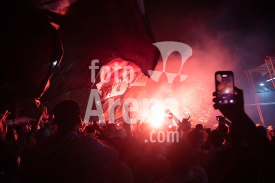 2869058 O conselho deliberativo pelo impeachment de Julio Casares, presidente do São Paulo Futebol Clube, acontece na noite desta sexta-feira (16) no MorumBIS, em São Paulo, SP. As torcidas organizadas do clube convocaram um protesto nos arredores do estádio pelos escândalos nos bastidores e o desempenho recente da equipe. Na foto, torcida comemora o impeachment de Julio Casares.