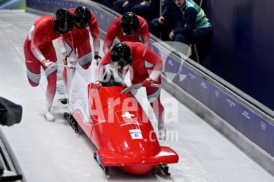 2891962 Cortina d'Ampezzo, Italia, 21 de fevereiro de 2026. Cedric Follador, Luca Rolli, Tim Annen e Omar Vogele, da Suica, em acao durante a primeira bateria da prova de bobsleigh de quatro homens dos Jogos Olimpicos de Inverno de 2026 em Cortina d'Ampezzo, Italia. (Foto de Igor Kupljenik/Sports Press Photo) (Igor Kupljenik / SPP)