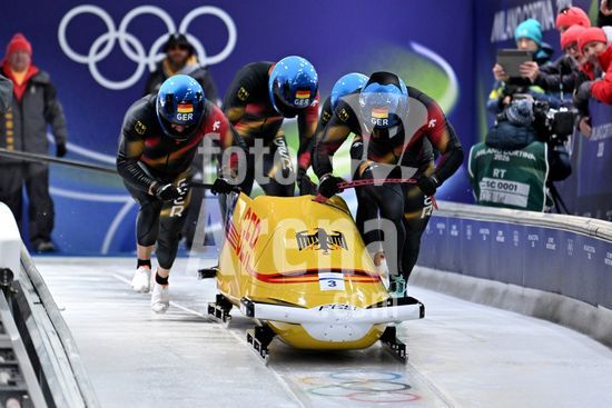 2891963 Cortina d'Ampezzo, Italia, 21 de fevereiro de 2026. Ammour Adam, Ammour Tasche, Schaller, da Alemanha, em acao durante a primeira bateria da prova de bobsleigh de quatro homens dos Jogos Olimpicos de Inverno de 2026 em Cortina d'Ampezzo, Italia. (Foto de Igor Kupljenik/Sports Press Photo) (Igor Kupljenik / SPP)