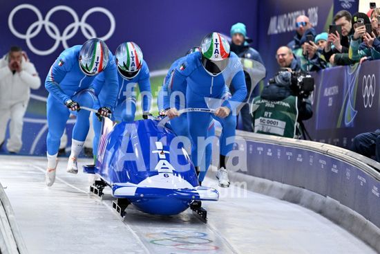 2891964 Cortina d'Ampezzo, Italia, 21 de fevereiro de 2026. Patrick Baumgartner, Lorenzo Bilotti, Eric Fantazzini e Robert Mircea, da Italia, em acao durante a primeira bateria da prova de bobsleigh de quatro homens dos Jogos Olimpicos de Inverno de 2026 em Cortina d'Ampezzo, Italia. (Foto de Igor Kupljenik/Sports Press Photo) (Igor Kupljenik / SPP)