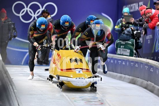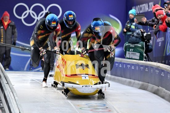 2891984 Cortina d'Ampezzo, Italia, 21 de fevereiro de 2026. Jakob Mandlbauer, Daniel Bertschler, Sebastian Mitterer e Daiyehan em acao durante a primeira bateria da prova de bobsleigh de quatro homens dos Jogos Olimpicos de Inverno de 2026 em Cortina d'Ampezzo, Italia. (Foto de Igor Kupljenik/Sports Press Photo) (Igor Kupljenik / SPP)